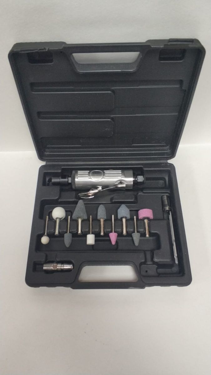 Комплект пневматической зачистной машинки с головкой 1/4" (6 мм), с аксессуарами в пластиковом ящике для переноски; в комплекте: 2 рожковых ключа и 10 шлифовальных насадок; рекомендуемое рабочее давление воздуха 4 бар, расход воздуха 108 л/мин, скорость своб. вращения 25000 об/мин, входное воздушное соединение 1/4".