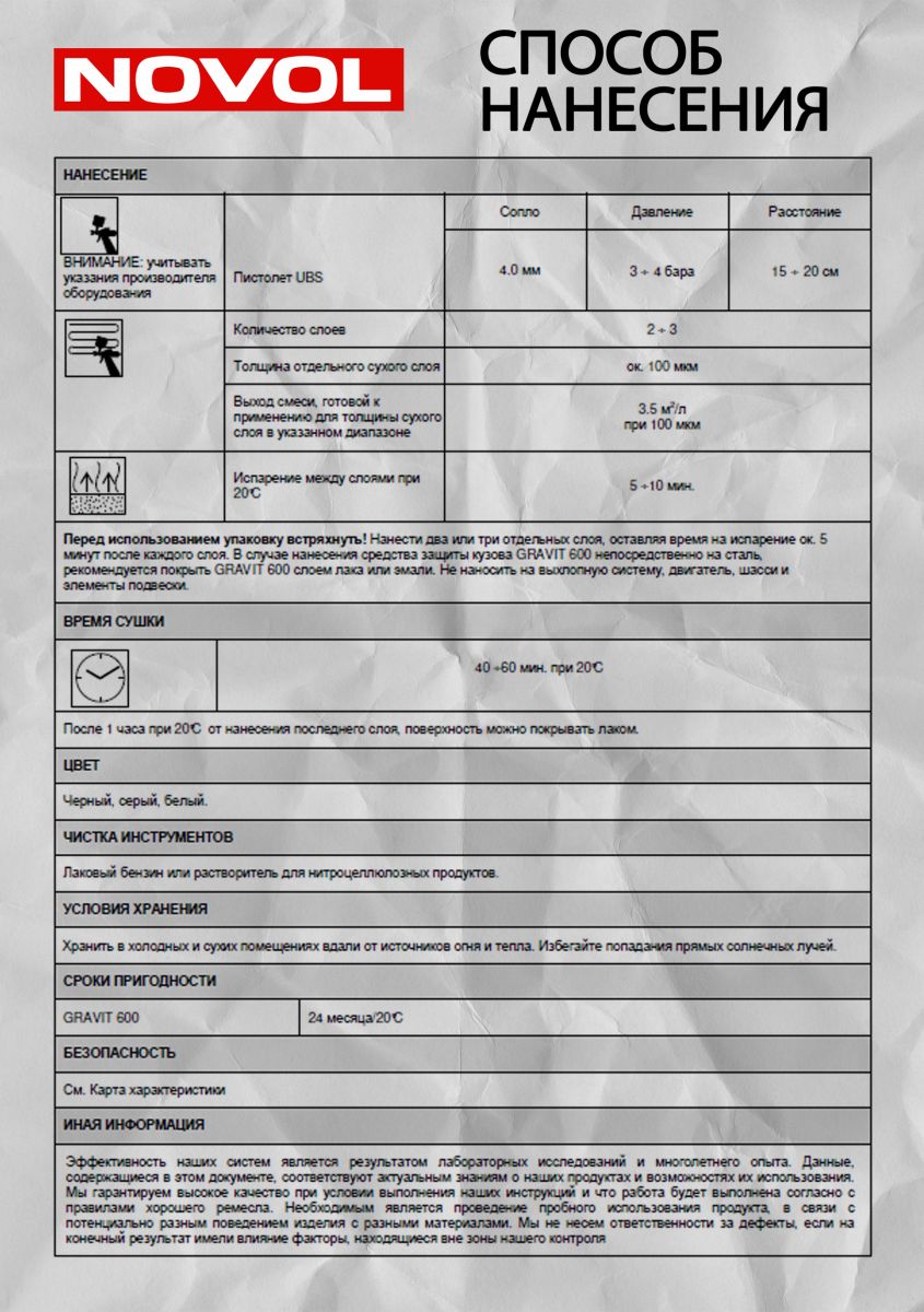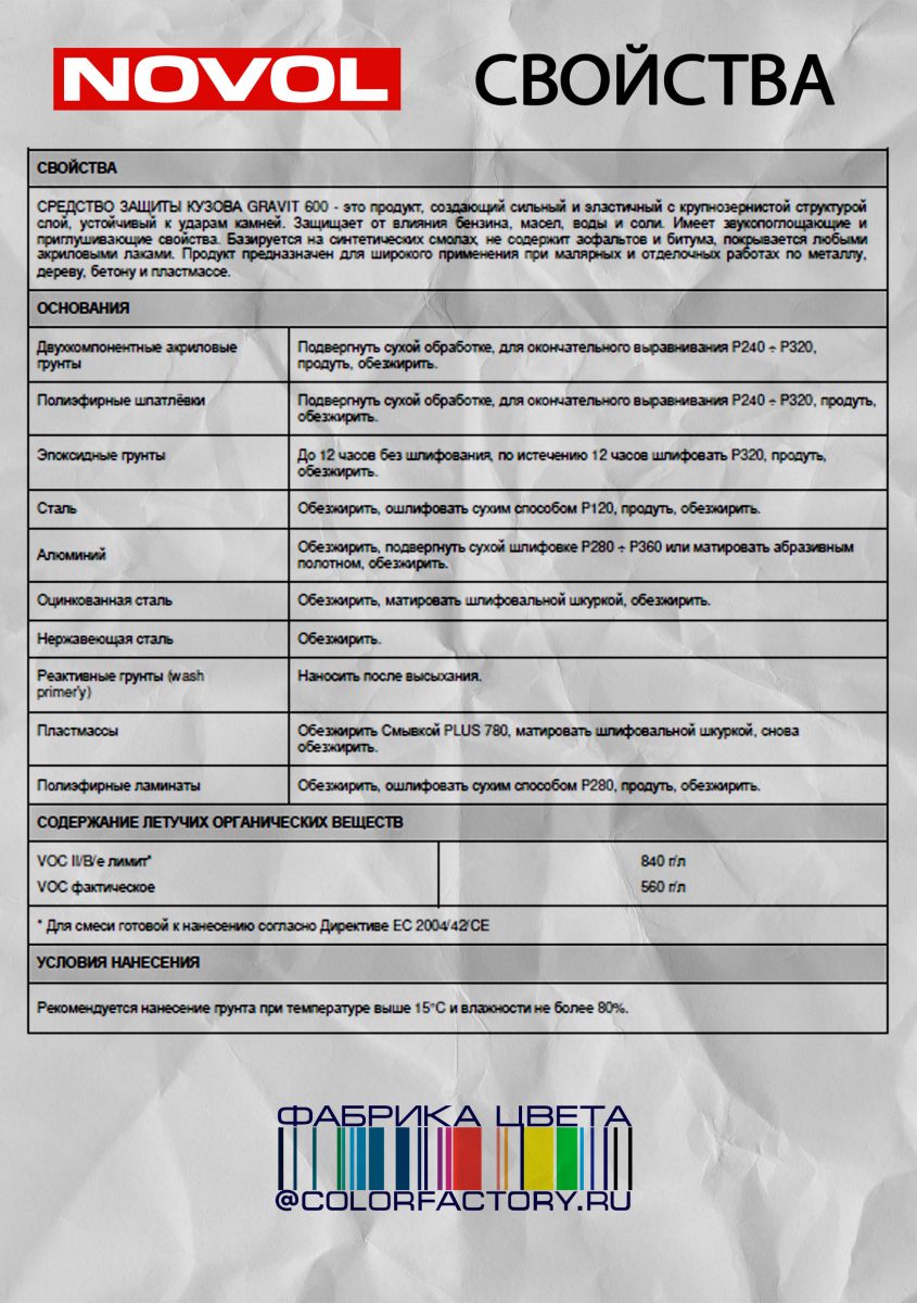 Средство для защиты кузова образует на поверхности прочную, эластичную плёнку с мелкозернистой структурой, устойчивой к ударам камней. Средство также защищает покрытие от воздействия бензина, масел, воды и солей, а также обладает шумопоглащающими свойствами. GRAVIT 600 производится на основе синтетических смол и не содержит асфальтов и битумов. Может покрываться любыми акриловыми лаками.