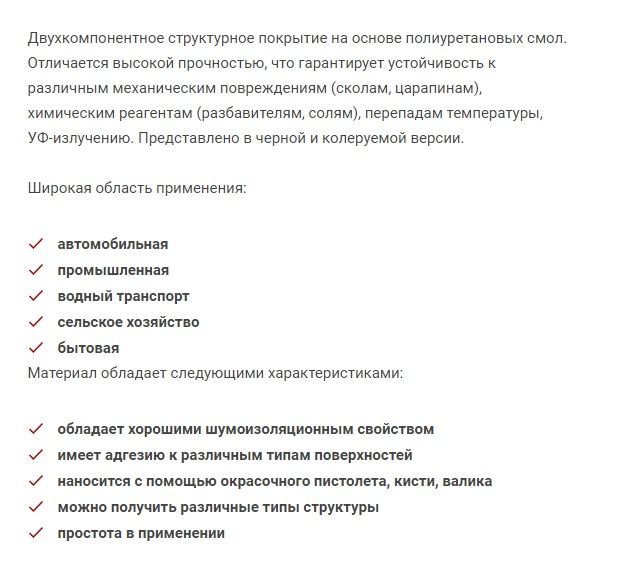 Двухкомпонентное структурное покрытие на основе полиуретановых смол. Отличается высокой прочностью, что гарантирует устойчивость к различным механическим повреждениям (сколам, царапинам), химическим реагентам (разбавителям, солям), перепадам температуры, УФ-излучению. Представлено в черной и колеруемой версии.